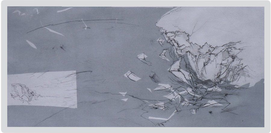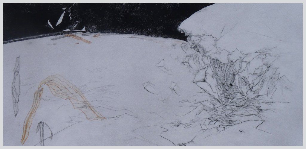 Titel: „gescheiterte Landschaft“ 2022. Die Version II ist mit einem Zitat der Skizze Strand von E. Grün versehen.